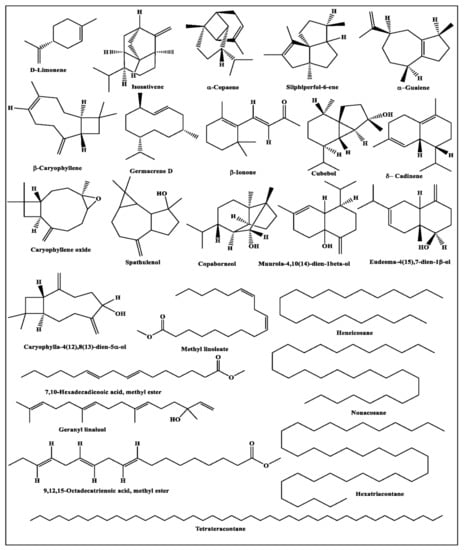 Essential oils are natural, volatile components with a complex nature, possessing mostly fragrant odors manufactured by the plants as secondary metabolites. They are commonly prepared either by hydro-distillation or steam distillation; meanwhile, they are highly popular due to their observable biological potential, which is highly attributed to their different classes of compounds, particularly terpenoids. They are popular for their antimicrobial, antiviral, anti-inflammatory, analgesic, spasmolytic, anticancer, anti-aging and anesthetic activities, in addition to their wide consumption in the preservation of foods [1,2,3,4,5].