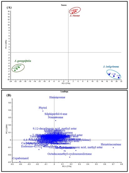 Score plot (A) and loading plot (B) of GC data collected from J. intigrimma, J. gossypifolia and J. roseae leaves essential oil analyses using unsupervised chemometric analysis (PCA).