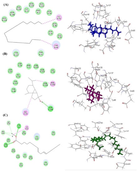 In silico molecular docking of the major compounds identified from Jatropha essential oils was performed within the active site of the adhesion proteins associated with E. coli that enable the bacterium to attach to the surfaces and consequently form its invasive biofilm as FimH (PDB ID 1TR7; 2.10 Å) downloaded from the protein data bank. The docking experiments were carried out using Discovery Studio 4.5 (Accelrys Inc., San Diego, CA, USA) using the C-Docker protocol. The results displayed in Table 3 revealed that heneicosane, followed by cubebol and methyl linoleate, displayed the best fitting score within the active center of E. coli adhesion protein FimH with free binding energies equal to −30.68, −8.92 and −4.55 Kcal/mole, respectively. Heneicosane forms two alkyl and π-alkyl bonds with Ile52 and Tyr48, in addition to the formation of Van der Waals interactions with many amino acid residues at the active center (Figure 4A). However, cubebol forms one conventional H-bond with Asp140, in addition to two alkyl and π-alkyl bonds with Ile13 and Phe142 together with Van der Waals bonds at the active site (Figure 4B). Regarding methyl linoleate, it forms two conventional H-bonds with Asn135 and Phe1, one alkyl bond with Ile52, in addition to three C-H bonds with Asp54 and Asn46, together with many Van der Waals interactions, as shown in Figure 4C.