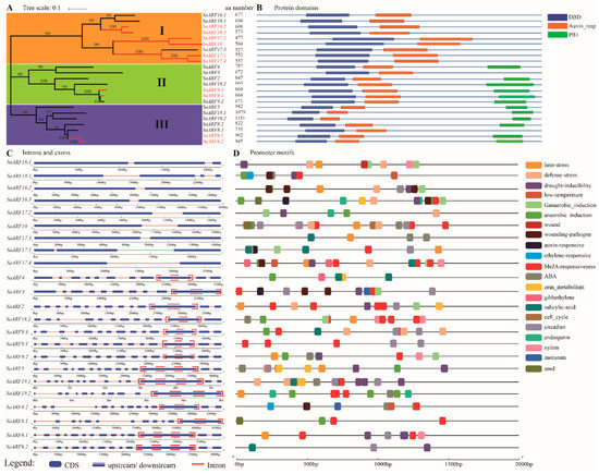 Phylogenetic analysis and sequence analysis of SaARFs. (A) Phylogenetic tree and amino acid number for each gene. Members signed by red were collinearity genes. aa, amino acid. (B) Protein domains, different colors indicated different domains. The blue, orange, and green areas indicated the DBD, Auxin_resp and PB1 domain, respectively. (C) Exons (blue areas) and introns (red lines). (D) Promoter motifs. The motifs were displayed, which were related with plant hormones, abiotic stress, and plant development. Different colors indicated different motifs.