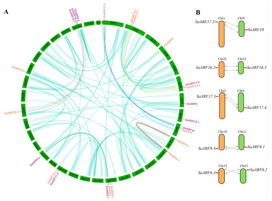 Genomic localization and hypothetical evolutionary histories of SaARFs. (A) The distribution of SaARFs in chromosomes and the collinearity relationships throughout the whole genome. The cyan lines indicated the collinearity relationships of genes (except SaARFs). Other colored lines indicated the collinearity relationships among SaARFs. The genes marked by purple IDs were located in the positive strand of DNA, while others signed by orange IDs were in negative strand. The black dotted lines indicated the collinearity area. (B) The grey lines indicated the predicted modes of chromosomal segment duplication.