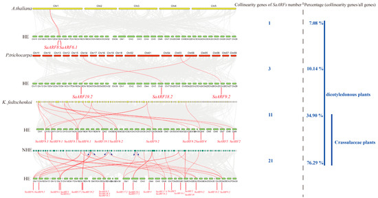 Collinearity relationships between HE and other species. The grey lines indicated collinearity relationships of other genes (except SaARFs). The red lines indicated the collinearity relationships of SaARFs. The blue arrows indicated that one ARF gene of NHE corresponded to two or three ARF genes of HE.