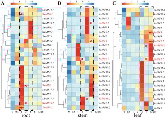 Expression patterns of SaARFs in different organs under Cd stress. (A)The expression level of 14 SaARFs in roots under Cd stress. The black dotted box indicated the highest expression level of 14 SaARFs in roots were observed during 1–4 h. The red arrows indicated the highest level of corresponding SaARFs during Cd stress. (B) The expression level of 18 SaARFs in stems under Cd stress. The black dotted box indicated the peak values of 18 SaARFs expressions were distributed between 2–8 h. (C) The expression level of 18 SaARFs in leaves under Cd stress. The black dotted box indicated the peak values of 18 SaARFs expressions in leaves were mainly found after 4 h.