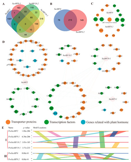 Similar segments of the hub-gene promoters and coexpression network analysis. (A) All related genes in the group of SaARF2, 9, 18.2, and 19. (B) The related genes in the group of SaARF4 and 8.2. (C,D) showed the coexpression network containing the transcription factors, transporter proteins and genes related with plant hormone. (E) Similar segments in the promoters of hub genes. The same color in each group indicated a common similar segment.