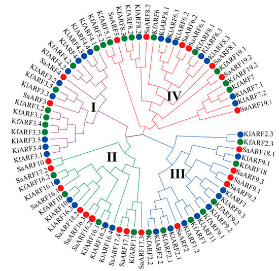 Phylogenetic analysis of ARFs among three Crassulaceae plants. I, II, III, IV indicated the first class to the fourth class in the figure. The circles with same color indicated the ARFs were in the same species. Green circle, K. fedtschenkoi; red circle, HE; blue circle, K. laxiflora.