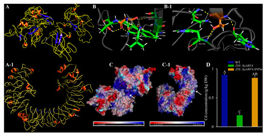 As shown in Figure 7, the structure of SaARF4-SNPm was seriously changed (Figure 7A-1) compared with SaARF4 (Figure 7A). The interaction proteins surrounding the mutant amino acid (aa) were changed from five aa (TYR-523, SER-524, LEU-535, THR-538, and PHE-516) of SaARF4 (Figure 7B, the orange one) to three aa (GLN-540, HIS-562, and HIS-566) of SaARF4-SNPm (Figure 7B-1, the orange one). Furthermore, the charge distribution of the two proteins indicated that the surrounding charges of the mutant AA (Figure 7C, the white arrow) were altered from the positive charges (Figure 7C, the blue areas) to the neutral charge (Figure 7C-1, the white areas). We also found that overexpressing SaARF4 can effectively decline the Cd content compared with WT plants of NHE (p < 0.01). However, the overexpression of SaARF4-SNPm did not significantly decrease Cd accumulation (Figure 7D), indicating that this SNP may play important roles in Cd accumulation.