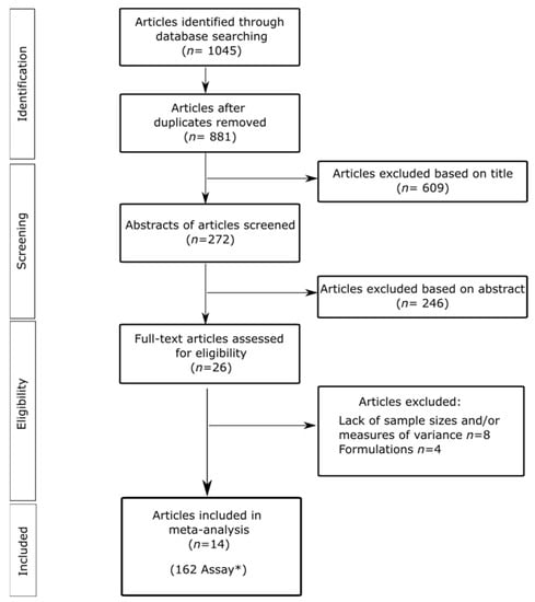 Figure 1 presents a summary of the literature search through different multidisciplinary databases. The initial search returned a total of 1045 articles. After removing duplicates (n = 164), 881 were recovered; next, 609 were excluded based on their titles, followed by 246 articles being excluded based on their abstract. Then, the full text of the 26 resulting articles was evaluated. Twelve studies did not meet the selection criteria: 4 articles evaluated insecticidal formulations and 8 articles lacked information regarding sample sizes and/or variance measures or only reported LC50. Finally, 14 studies (162 assays) met the inclusion criteria and were included in the analyses. The selected articles and the main compounds of the EOs are presented in Table 1.