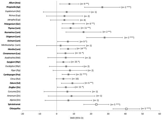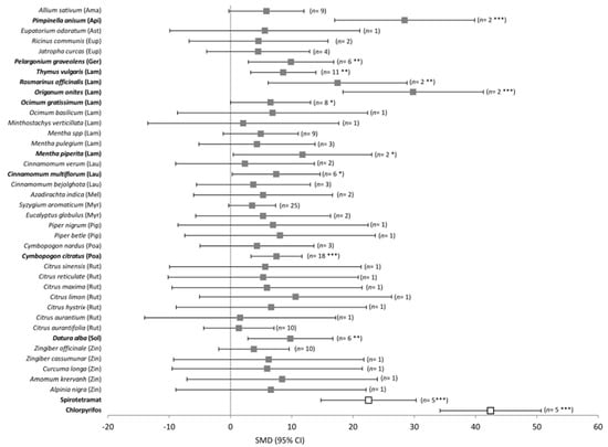 According to the meta-analyses conducted, the genera Allium (Amaryllidaceae), Pimpinella (Apiaceae), Pelargonium (Geraniaceae), Mentha (Lamiaceae), Ocimum (Lamiaceae), Origanum (Lamiaceae), Rosmarinus (Lamiaceae), Thymus (Lamiaceae), Cinnamomum (Lauraceae), Syzygium (Myrtaceae), Cymbopogon (Poaceae), Datura (Solanaceae), and Zingiber (Zingiberaceae) showed mean effects very different from the rest of the genera, with Origanum and Pimpinella being the ones with higher effects, similar to those of the synthetic insecticides chlorpyrifos and spirotetramat (QM = 110.6218, df = 25, p < 0.0001; Figure 2).