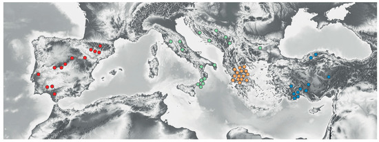 Map of the Mediterranean region, showing the geographic distribution of the sampled populations. In red, populations from the Iberian Peninsula; in green, populations from the Italian Peninsula and Northern Balkans; in cream, populations from Greece; in blue, populations from Turkey. The base map was downloaded from https://maps-for-free.com/ (accessed 23 June 2022).
