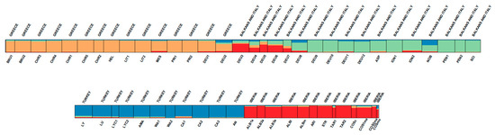 - Pritchard, J.K.; Stephens, M.; Donnelly, P. Inference of population structure using multilocus genotype data. Genetics 2000, 155, 945–959. [Google Scholar] [CrossRef] [PubMed]