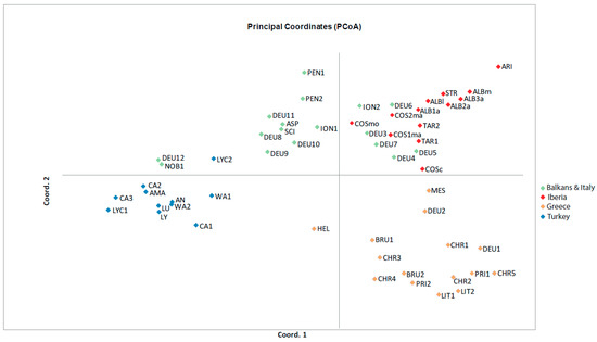 According to the approach of [28] for calculating the best number of clusters (K), the most likely value of K was 4 (Supplementary Figure S1), in agreement with the four biogeographic areas of subsection Phalolepis: Greece (cream color in Figure 2), Turkey (blue), the Iberian Peninsula (red) and Italy and the Northern Balkans (green), although this last region showed a high degree of admixture, specifically in the Northern Balkans (Figure 2). In the principal coordinate analysis (PCoA) at population level (Figure 3), the resolution was good as far as the Greek and Turkish populations were concerned. However, the Balkan and Italian populations ION2, DEU3, DEU4, DEU5, DEU6 and DEU7 showed a clear overlapping zone with the Iberian populations in Figure 3; in these six populations, the presence of the Iberian genetic cluster (indicated by the red color in Figure 2) was evident in the Structure analysis.