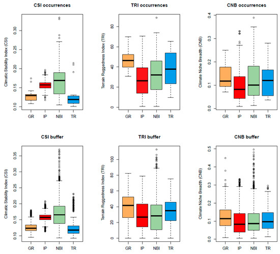 Values for the Climate Stability Index (CSI), the Terrain Ruggedness Index (TRI) and the Climate Niche Breadth (CNB) for each of the speciation centers, by (1) using only the species’ occurrence points and (2) using buffer areas of 10 km around each occurrence. GR, Greece; IP, Iberian Peninsula; NBI, Northern Balkans–Italy; TR, Turkey.