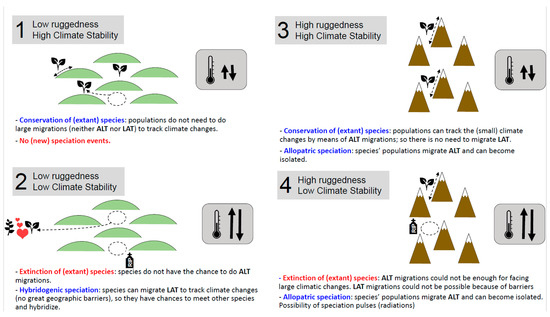 Possible scenarios resulting from the combination of various ruggedness and climatic stability conditions, and their consequences on the population dynamics and evolutionary patterns of plant species. Blue, net increase (or conservation) of species; red, net loss of species. ALT, altitudinally; LAT, latitudinally/longitudinally.