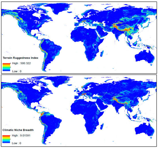 Maps of the Terrain Ruggedness Index (TRI) and the Climate Niche Breadth (CNB) values at a 2.5 arc-min grid resolution for the whole planet. Colors range from blue for low values to red for high values; the color gradient shows equal interval breaks.