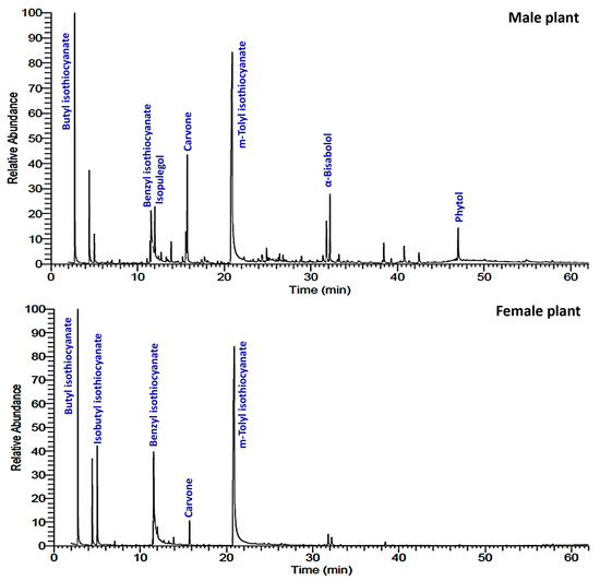 The significant variation in the chemical constituents between the current results and previous data might be ascribed to variations in organs, genotypes, ages, climate, weather, humidity, and environmental conditions [36,37,38]. Moreover, our data revealed the role of the gender of the plant on the phytochemical compositions including the VOs [39,40]. The richness of the compounds in the male plants compared to the female ones could be attributed to the fact that female plants invest less in chemical defense and more into biomass production than male plants [41], where the VOs can be considered a good indicator for the degree of chemical defense in plants due to its distinct variability with the biotic and abiotic stresses [22,42].