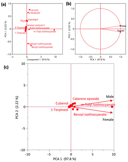 In order to show the variation between male and female plants of O. arabicus, the data of the concentration of all identified compounds in the VOs were subjected to the Principal Components Analysis (PCA), where it revealed a slight variation in the composition (Figure 4). The main components that showed clear segregation were isobutyl isothiocyanate, benzyl isothiocyanate, m-tolyl isothiocyanate, butyl isothiocyanate, farnesyl acetone C, isopulegol, phytol, α -bisabolol, and carvone (Figure 4a). The male plants showed a close correlation with m-tolyl isothiocyanate and calarene epoxide, while female plants showed a close correlation with benzyl isothiocyanate and m-tolyl isothiocyanate (Figure 4c). This variation between male and female plants supports the issue that a plant’s gender affects the chemical composition of the secondary metabolites [21,40].