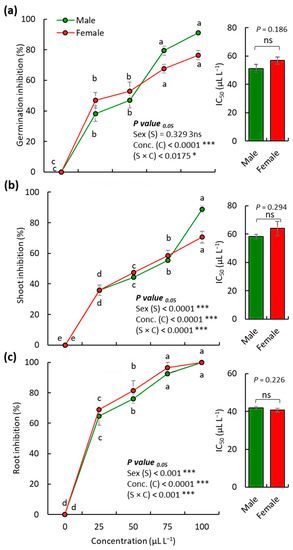 Based on the IC50 values, no significant variation in either the germination or seedling growth of D. aegyptium was observed between the male and female plants of O. arabicus (Figure 5). The O. arabicus VOs of the male plants attained IC50 values of 51.10, 58.05, and 63.91 μL L−1 for the seed germination, seedling shoot growth, and seedling root growth, respectively, while the female plants showed IC50 values of 56.75, 41.93, and 40.71 μL L−1, respectively. These data showed that the variation in the VOs composition (either quality or quantity) has a consequential effect on its biological activities [45]. In this context, the male plants of Baccharis dracunculifolia DC. have been reported to produce higher levels of essential oil and phenolic compounds compared to female plants, which leads to greater antioxidant capacity [46]. Moreover, the bioactive compounds (total phenolics, flavonoids, and tannins) and antioxidant activities of Pistacia atlantica Desf. were more influenced by growing region than by gender [47].