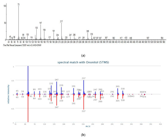 GC/MS spectra of (a) derivatized ononitol of methanolic extract, and (b) ononitol from the extract and MS spectra of standard of Golm Metabolome Database (GMD).