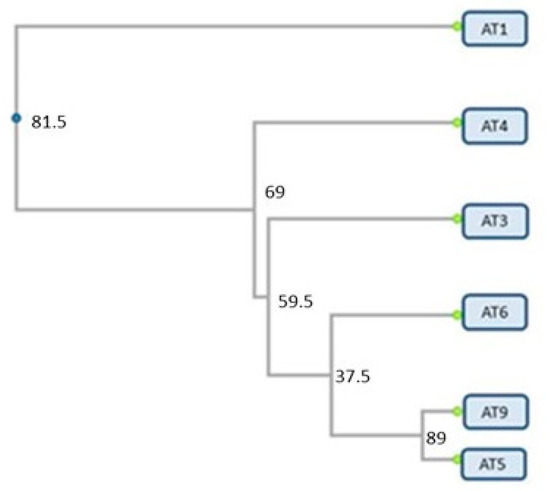 Cluster dendrogram based on the Nei’s genetic distances among populations. Codes of the samples (AT1, AT3, AT4, AT5, AT6, AT9) are given according to Table 6.