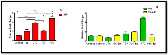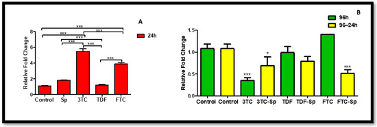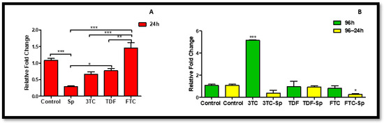 Effects of SP and HAART (3TC, TDF, and FTC) on MiR-146a levels. MiR-146a levels after exposure of HepG2 cells to (A) SP and HAART for 24 h, (B) HAART (96 h), and HAART (96 h) followed by SP (24 h); * p < 0.05, *** p < 0.0001.