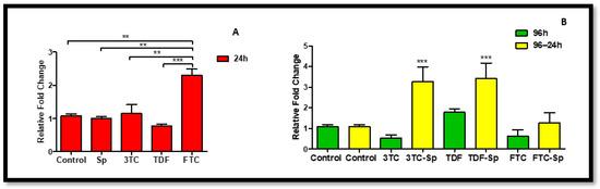 Effects of SP and HAART (3TC, TDF, and FTC) on Cox-1 mRNA expression. Cox-1 mRNA expression after exposure of HepG2 cells to (A) SP and HAART for 24 h, (B) HAART (96 h), and HAART (96 h) followed by SP (24 h); ** p < 0.005, *** p < 0.0001.