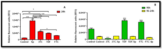 Effects of SP and HAART (3TC, TDF, and FTC) on intracellular LDH levels. Intracellular LDH levels after exposure of HepG2 cells to (A) SP and HAART for 24 h, (B) HAART (96 h), and HAART (96 h) followed by SP (24 h); * p < 0.05, ** p < 0.005, *** p < 0.0001.