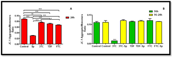 Mitochondrial response. Δmψ represented as a ratio of JC-1 aggregates and JC-1 monomers. The Δmψ after exposure of HepG2 cells to (A): SP and HAART for 24 h, (B): HAART (96 h), and HAART (96 h) followed by SP (24 h); * p < 0.05, ** p < 0.005, *** p < 0.0001.