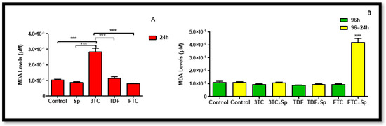Extracellular MDA levels in SP and HAART (3TC, TDF, and FTC)-treated HepG2 cells. Extracellular MDA levels after exposure of HepG2 cells to (A) SP and HAART for 24 h, (B) HAART (96 h), and HAART (96 h) followed by SP (24 h); *** p < 0.0001.