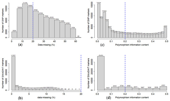 Number of DArTSeq markers by missing data (%) and PIC values for SNP (a,c) and SilicoDArT markers (b,d), respectively. The dotted blue vertical line indicated the threshold value for filtered markers.
