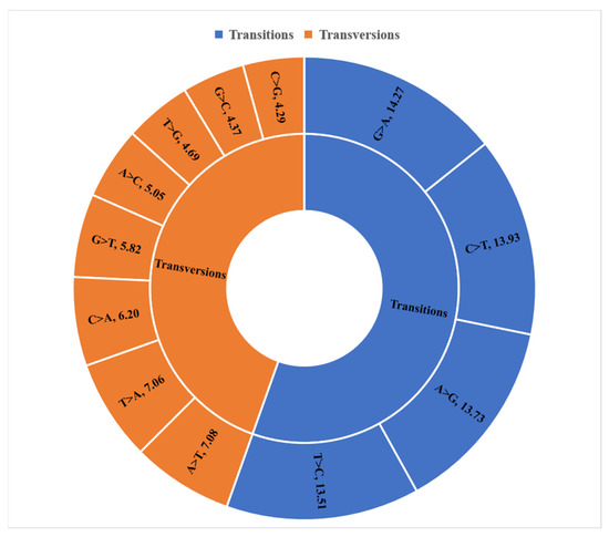 Proportion of SNP markers by transition and transversion polymorphisms.