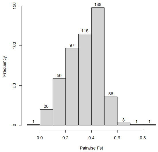 Passport data shows that 161 accessions in the collection were obtained from 25 countries. Of these, coordinate (latitude and longitude) information is available for 136 accessions. The coordinate information was converted to geographical distances using the distm() function of the R package geosphere [17] and was then used for Mantel correlation analysis to assess the relationship between the geographical and genetic distances. The results showed non-significant correlation between the geographical and genetic distances (r = 0.097, p-value = 0.055 for SNP and r= 0.06158, p-value= 0.123 for SilicoDArT markers). We also conducted analysis of molecular variance for the population according to their geographical origin and assessed how the genetic differentiation is related to the geographical origin of the accessions. The results revealed the within population diversity contributed a large proportion of the total diversity (Table 4). Despite a small proportion, the variation between populations collected from different countries of origin was significant, indicating the uniqueness of the accessions from the different countries. Population pairwise Fst value ranged from −0.007 to 0.782 with a mean of 0.126 using SNP markers (Figure 8, Supplementary Figure S3).