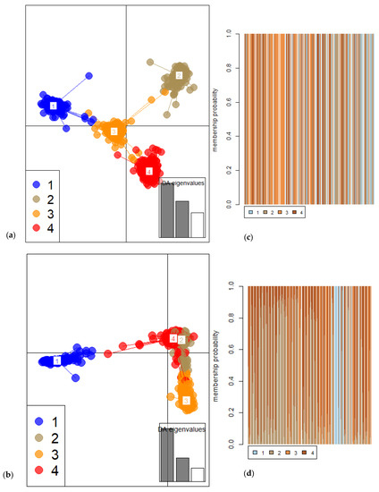 - Evanno, G.; Regnaut, S.; Goudet, J. Detecting the number of clusters of individuals using the software STRUCTURE: A simulation study. Mol. Ecol. 2005, 14, 2611–2620. [Google Scholar] [CrossRef]