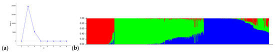 - Pritchard, J.K.; Stephens, M.; Donnelly, P. Inference of population structure using multilocus genotype data. Genetics 2000, 155, 945–959. [Google Scholar] [CrossRef]