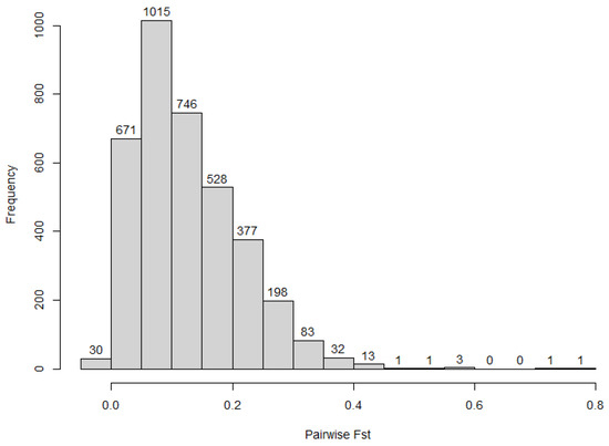 - Weir, B.S.; Cockerham, C.C. Estimating F-Statistics for the analysis of population structure. Evolution 1984, 38, 1358–1370. [Google Scholar] [PubMed]
