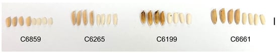 - Zhu, B.F.; Si, L.; Wang, Z.; Zhou, Y.; Zhu, J.; Shangguan, Y.; Lu, D.; Fan, D.; Li, C.; Lin, H.; et al. Genetic Control of a Transition from Black to Straw-White Seed Hull in Rice Domestication. Plant Physiol. 2011, 155, 1301–1311. [Google Scholar] [CrossRef]