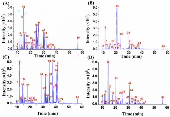Total ion chromatograms (TICs) of four Citrus spp. leaf essential oils. (A) C. limon; (B) C. hystrix; (C) C. microcarpa; and (D) C. pyriformis. The numbering of the phytoconstituents is provided in Table S1 (Supplementary Information).