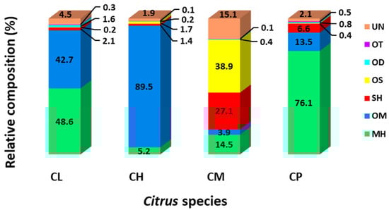 Relative phytochemical compositions (%) of the analyzed Citrus spp. leaf essential oils: C. limon (CL), C. hystrix (CH), C. microcarpa (CM), and C. pyriformis (CP). The constituents included monoterpenic hydrocarbon (MH), oxygenated monoterpenes (OM), sesquiterpenic hydrocarbon (SH), oxygenated sesquiterpene (OS), oxygenated diterpenes (OD), other subgroups of metabolites (OT), and unidentified compounds (UN).