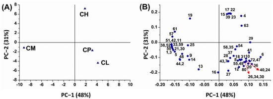 Principal component analysis (PCA) of the identified volatile compounds in leaf essential oils derived from four Citrus species. (A) Score plot, and (B) loading plot. C. hystrix (CH), C. limon (CL), C. pyriformis (CP), and C. microcarpa (CM). The peak numbering refers to Table S1 (Supplementary Information).