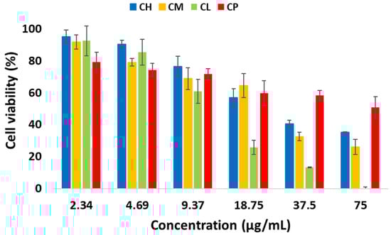 Antiproliferative activity of the four Citrus spp. leaf oils against the HeLa cervical cancer cell line. C. hystrix (CH), C. limon (CL), C. pyriformis (CP), and C. microcarpa (CM). Values are means of three replicates ± standard deviation. p-values < 0.01, as determined using one-way ANOVA.