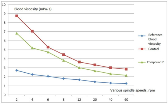 | Blood viscosity after 1 h of incubation at 43 °C, samples with compound 2, n = 4 | 6.83 ± 0.10 | 5.21 ± 0.06 | 4.74 ± 0.08 | 3.81 ± 0.08 | 3.01 ± 0.6 | 2.67 ± 0.9 | 2.32 ± 0.15 | 2.17 ± 0.10 |
