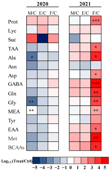Heat map analysis summarizing statistically significant tomato fruit responses to different commercial biostimulant treatments (M = Micosat F Tab Plus, E = EKOprop NX, F = Fidelius) compared to C = control. Results were calculated as Logarithm base 1.2 (Log1.2) of treatments/control in the two years of agronomic cultivation (2020–2021) and visualized using a false color scale with red indicating an increase and blue a decrease. No differences were visualized by blank squares. *, **, *** = significant at p ≤ 0.05, 0.01 and 0.001, respectively, and indicate significant differences between treatment × year according to Tuckey’s range test (p ≤ 0.05).