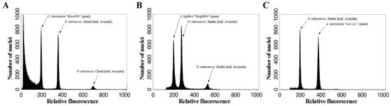 Estimation of (A) Cibotium taiwanense “Kuo4395”, (B) Sphaeropteris lepifera “Tang0001”, and (C) Alsophila metteniana “Lee s.n.” spore genome sizes by flow cytometry using the internal standards of leaf nuclei of Pisum sativum cv. Ctirad and Nicotiana tabacum cv. Xanthi.
