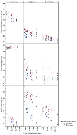 Generally, most trends for the resulting quality and quantity match with our expectations (Figure 1 and Figure 2; Figures S1–S3), and vortex duration is an important contribution to bead vortex results (Table 2). The results are similar between S. lepifera and A. metteniana, in which longer vortex duration was usually accompanied by higher coefficient variation (CV), non-nuclear particles (np), and relative recovery rate (rrr) values (Figure 2 and Figure S3; see “4.2. Protocol optimization” for the calculation of these values), several of which are also significantly supported by the ANOVA results (Table 2). However, the rrr value decreased during the higher spore/bead ratio, and showed a clear opposite trend against our expectation (Figure 2). This pattern instead implies that an increase in spore amount in a tube could not proportionally increase the quantity of nucleus particles. The peak of the rrr value might appear in a low spore–bead ratio, which is likely beyond the ratio values surveyed in the current study. Last, patterns in C. taiwanese suggest that none of the treatments can prevent a high np result under bead vortexing (Figure 3). The pattern coordinates with its low ratio of spore nuclear size and spore size, and implies that properties of infra-sporic structures in certain species might affect the quality of nuclear extraction.