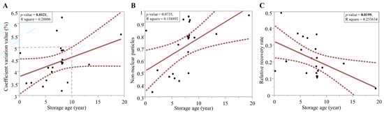 Linear regression of time and (A) coefficient variation value, (B) non-nuclear particles value, and (C) relative recovery rate of 4 °C-stored Sphaeropteris lepifera spore collections.