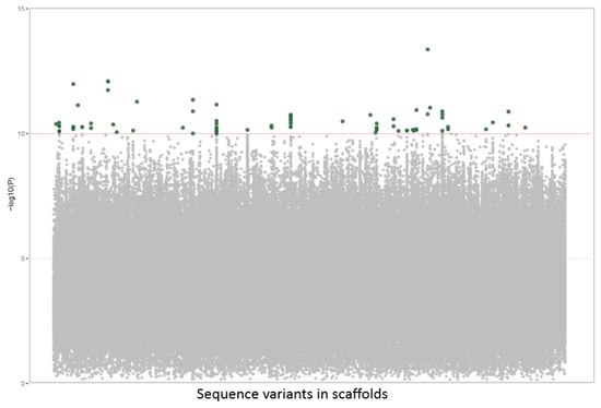 Manhattan plot of the fruit size GWAS results. Variants selected as GM associated with the fruit size phenotype (−log10p value above 10), green dots. Unselected variants, gray dots.