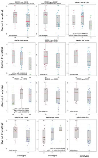 The 31 GMs obtained in the 16 GM clusters analyzed in the “Frantoio” x “Picual” progeny were found to include genetic variants that are inherited as haplotypes. Only in four GMs could the inheritance model for the recessive/dominance or additive mode be analyzed. At least two of the four GMs presented a recessive/dominance model, and the other two were not completely clear, but a third GM could have a recessive/dominance model and another could follow the additive model. Thus, complete dominance relations seemed frequent in this polygenic trait. The segregating progeny study confirmed the linkage of 9 GM clusters of the 16 that were analyzed (Figure 2). For all the unconfirmed clusters, only two genotypes were observed: one heterozygous and the other homozygous. If these genes presented a recessive/dominance inheritance model, and if the homozygous plant had the dominant allele, no differences between the two genotypes could be expected. For this reason, the seven unconfirmed GM clusters could still be good GMs for determining fruit size. In fact, the number of unconfirmed clusters could be the expected one if the recessive/dominance model was the commonest in the genes that coded for the fruit size trait. All these data indicated that the GWAS analysis produced high-quality GMs, which might be confirmed by future works analyzing more segregating progenies from other genetic crosses.
