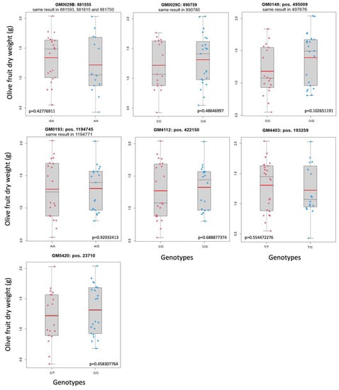 GWAS analysis is expected to facilitate olive genetic breeders’ work. In this context, a first GWAS analysis of four olive traits has been recently described []. In this work, we ran a GWAS analysis to look for GMs to be used to select olive genotypes with a larger/heavier fruit size. The GWAS analysis was run with the genomic data of 50 genotypes, 40 cultivated olive varieties and 10 wild olive ones [], and also with the phenotypic data from the WOGBC database [,] and the wild phenotypes obtained in this work (Supplemental Table S1). Although 50 accessions may seem scarce for a GWAS analysis, they were selected to represent more than 90% of the genetic variability of the cultivated olive tree and a wide geographical representation of the wild olive trees. Furthermore, we analyzed the whole sequenced genomes, a better method indeed than GBS technology for GWAS analysis []. This is probably why we obtained GWAS p-values 1,000,000-fold smaller than the GM p-values in a previous GWAS analysis in olive [], with a Manhattan plot cut-off about 4 in [] in contrast to 10 in our work. Even more relevant is that we got experimental confirmation of a number of GMs obtained in the GWAS analysis.