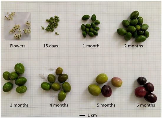 The transcriptomic analysis of fruit development was carried out by RNAseq. For the transcriptomics study, flower and fruit samples were obtained from three “Picual” trees growing in the experimental field of the Universidad de Jaén. To reduce environmental variability, samples were collected from closely located trees and south-facing branches at different time points during fruit development, i.e., from the first day of flowering, 15 days later, and every month up to 6 months when olive fruit ripened. Total RNA was extracted with the Spectrum™ Plant Total RNA kit (Merck KGaA, Darmstadt, Germany). PoliA+ RNA was purified and sequenced with the Illumina Novaseq 6000 platform at Novogene. At least 50 Gb of the Q30 sequences data were obtained from each biological replicate sample. The RNAseq analysis was performed with DNAstar (ArrayStar 17, Rockville, MD, USA) for the RNA-seq analyses (www.dnastar.com) (accessed on 11 November 2022).