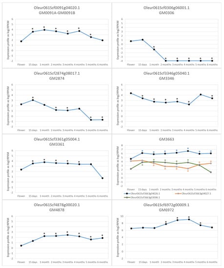 This cluster included four GMs and, according to TASSEL, there were 23 genes in LD with them. Only eight of these genes were expressed during fruit development and four of them were hundreds of kbases away from GMs. So, they were unlikely to be found in a real LD with the GM0306 cluster. Gene Oleur061Scf0306g06001.1 was placed over GM0306 and coded for DNA polymerase III, subunit gamma/tau, P-loop containing nucleoside triphosphate hydrolase in bacteria, and was also present in plants, but with no clear function [,]. It was expressed in flowers and very early fruit development steps to be repressed after the second month of fruit development (Figure 5). Therefore, it could promote DNA replication in the early developing fruit stage, a time when cell division activity is considerable. Another gene was S-adenosyl-L-methionine-dependent methyltransferase (Oleur061Scf0306g06010.1), which is homologous to AT1G24480.1, could be involved in cell differentiation and development growth. It was highly expressed in flowers, which lowered to be repressed from the second month and be re-induced at 6 months of development. Gene differentiation was more likely to be important immediately after full flowering and ovule fecundation in the first rapid cell division stages of fruit, although this was not the case of this gene. Therefore, it was less likely to be a determinant for fruit size. The other two genes, Oleur061Scf0306g06016.1 and Oleur061Scf0306g06017.1, coded for an initiation factor eIF-4 gamma and a tetratricopeptide-like helical domain, but did not seem to be good candidates to control fruit size.