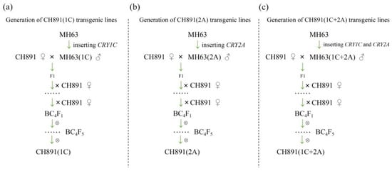 The development of transgenic restorer lines: (a) CH891(1C) was produced by backcrossing MH63(1C) as a donor parent with CH891 as a recurrent parent; (b) CH891(2A) was produced by backcrossing MH63(2A) with CH891, and (c) CH891(1C+2A) was produced by backcrossing MH63(1C+2A) with CH891.